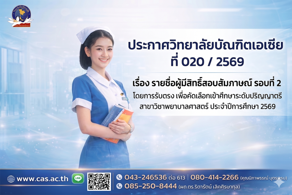 ประกาศวิทยาลัยบัณฑิตเอเซีย ที่ 020 / 2569 เรื่อง รายชื่อผู้มีสิทธิ์สอบสัมภาษณ์ รอบที่ 2 โดยการรับตรง เพื่อคัดเลือกเข้าศึกษาระดับปริญญาตรี สาขาวิชาพยาบาลศาสตร์ ประจำปีการศึกษา 2569